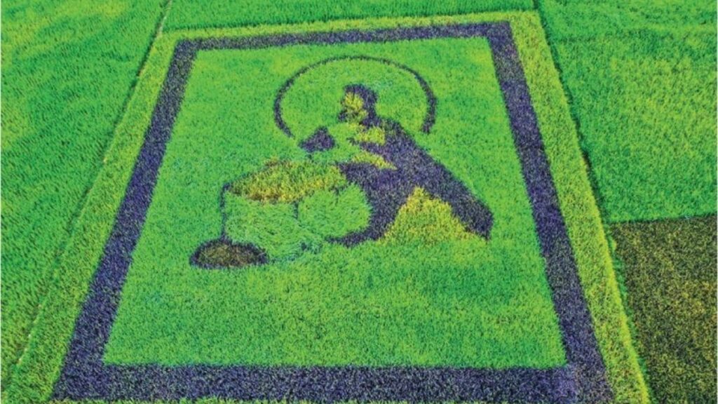 നിറങ്ങള് ചാലിച്ചാണോ ചിത്രം വരച്ചിരിക്കുന്നതെന്ന് തോന്നുമെങ്കിലും വ്യത്യസ്ത നിറത്തിലുള്ള നെല്ച്ചെടികള് പ്രത്യേകം ക്രമപ്പെടുത്തി നട്ടുവളര്ത്തിയാണ് ഇത് നിര്മ്മിച്ചിരിക്കുന്നത്. വിവിധ ഉയത്തിലും വലുപ്പത്തിലും നിറത്തിലുമുള്ള ചെടികള് വളര്ത്തിയാണ് ചിത്രം ഉണ്ടാക്കിയിരിക്കുന്നത്. 30 സെന്റ് സ്ഥലത്താണ് പാഡി ആര്ട്ട് എന്ന് അറിയപ്പെടുന്ന ഈ കല പ്രസാദ് സൃഷ്ടിച്ചിരിക്കുന്നത്. ആദ്യം ഉഴുത് മറിച്ച പാടത്ത് യേശുവിന്റെ ചിത്രം വരച്ചത് ചിത്രകാരനായ ഇ ഡി റെജി മാടക്കരയാണ്.