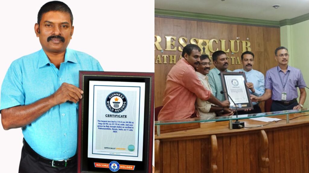 കാര്ഷിക മേഖലയില് കേരളത്തില് ആദ്യമായി ഗിന്നസ് റെക്കോർഡ് നേടി റെജി ജോസഫ്. 114 സെന്റിമീറ്റര് നീളവും 94 സെന്റീമീറ്റര് വീതിയുമുള്ള ചേമ്പിന്റെ ഇല സ്വന്തമായി ഉല്പ്പാദിപ്പിച്ചതിന് ദി ലാര്ജസ്റ്റ് ടാരോ ലീഫ് (The largest taro leaf) കാറ്റഗറിയുടെ ഗിന്നസ് വേള്ഡ് റെക്കോര്ഡ് റെജിയെ തേടി എത്തിയത്. പത്തനംതിട്ട ജില്ലയിലെ റാന്നി സ്വദേശിയാണ് റെജി ജോസഫ്.